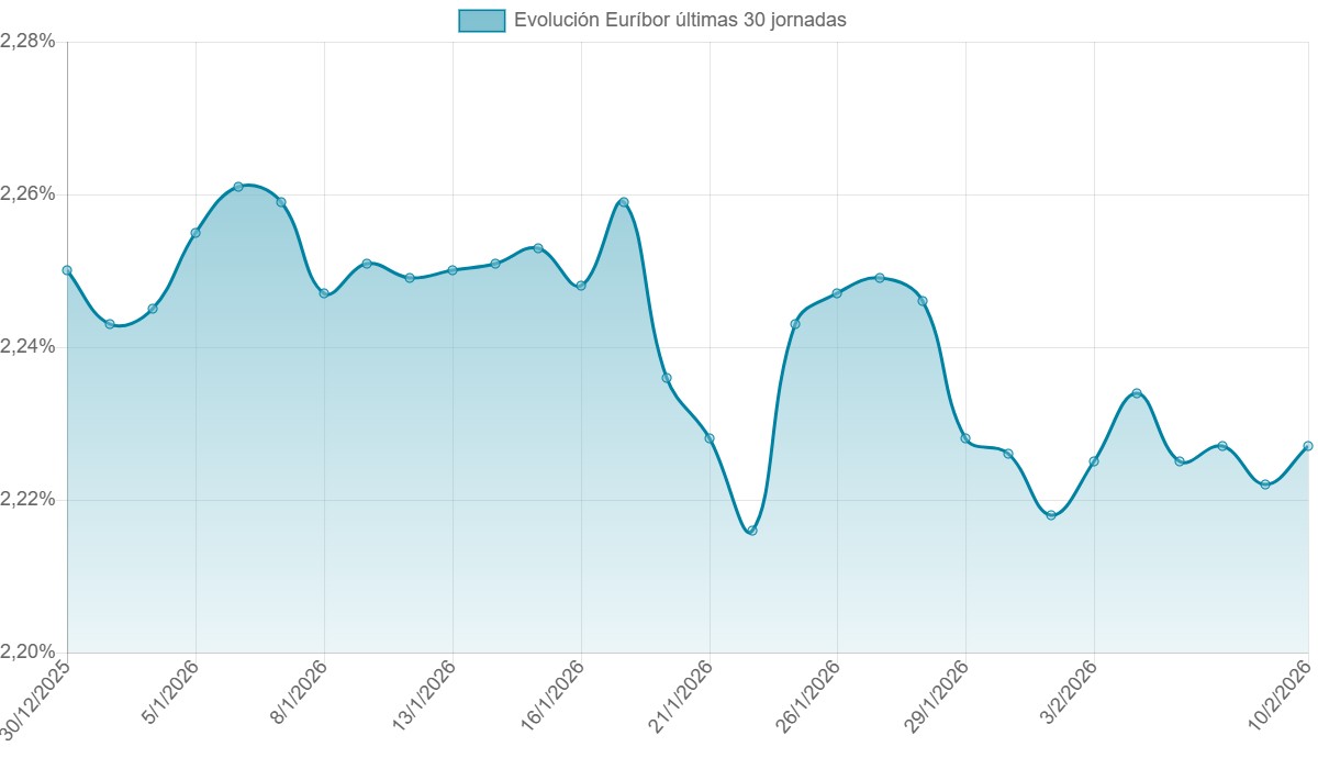 Con esta nueva cotización, la media provisional de febrero queda también en el 2,225%, tras siete jornadas de cotización. Todavía es pronto para hablar de un cierre definitivo, pero el rango en el que se mueve el Euríbor empieza a resultar familiar.